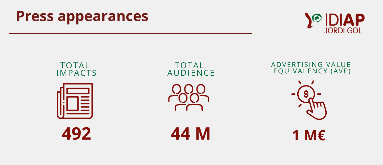During the year 2023, 22 press releases were issued, some of them in collaboration with other institutions. This resulted in the appearance of 492 impacts in the press, both print and digital, with an advertising equivalent value of 1.148.854 euros.